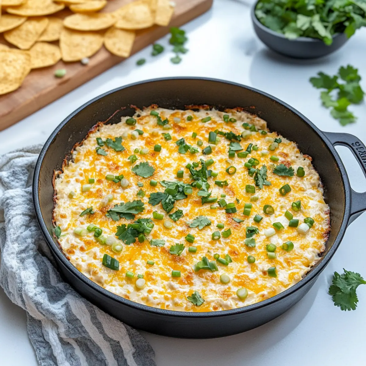 Once baked and broiled to perfection, remove the dip from the oven. Garnish with the reserved scallion greens and fresh cilantro for a burst of color and flavor. Serve immediately with crispy tortilla chips or fresh veggie sticks, enjoying the vibrant flavors of this lightened-up Baked Elote Dip!