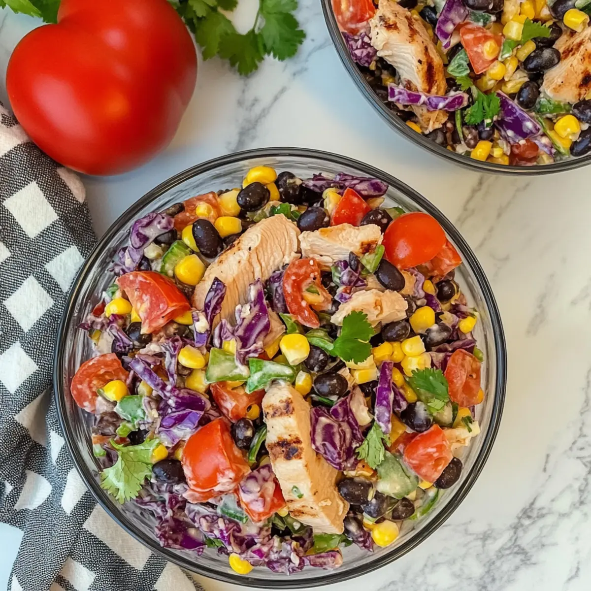 - In a large bowl, mix black beans, corn, red cabbage, tomatoes, carrots, green onions, and cilantro. Fold in grilled chicken.