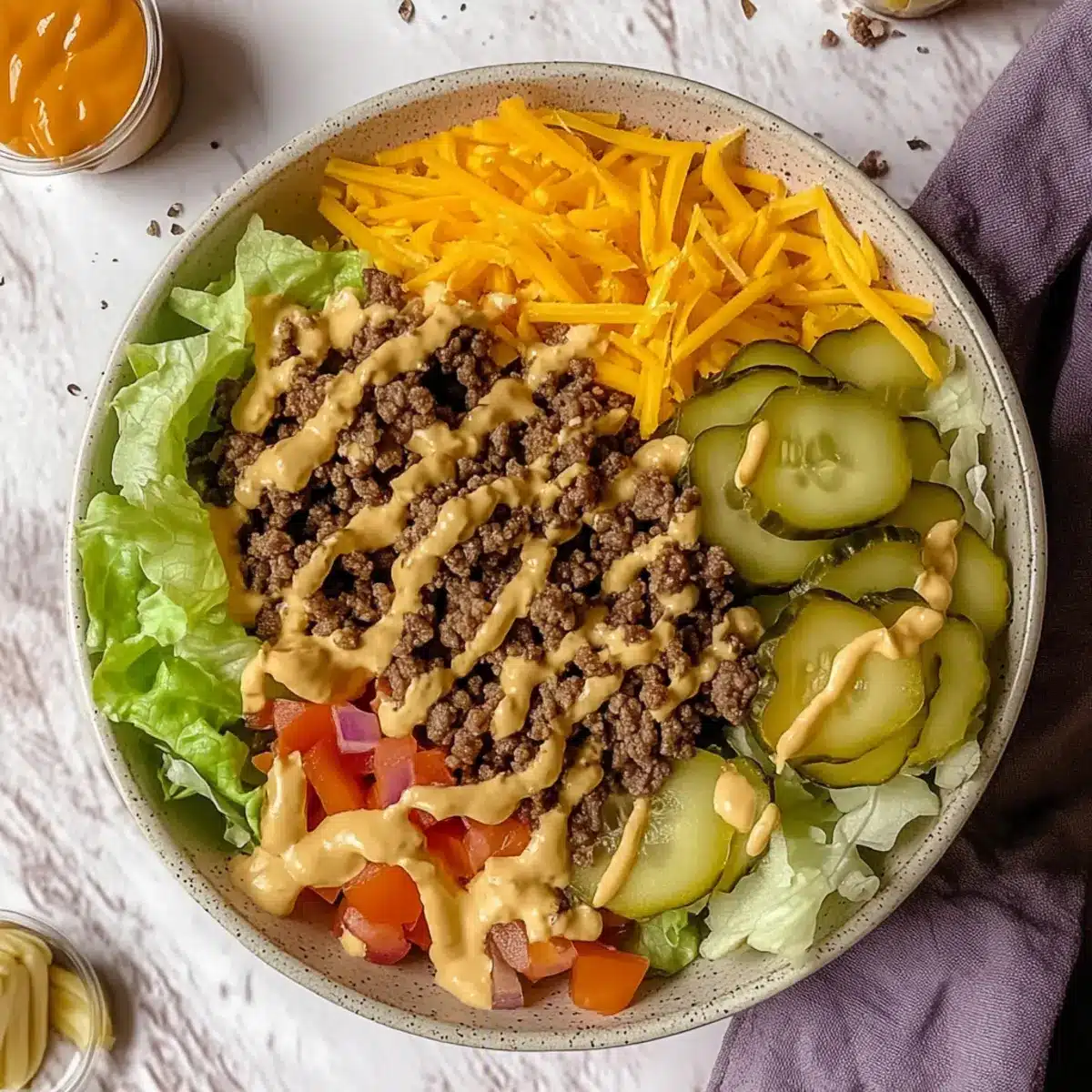 In a large serving bowl, start layering your Big Mac Salad. First, place a generous base of the chopped lettuce, followed by the cooked ground beef. Sprinkle the shredded cheddar cheese on top, then add the diced pickles and onions. Drizzle with the special sauce, keeping it separate until just before serving for optimal freshness and crunch.