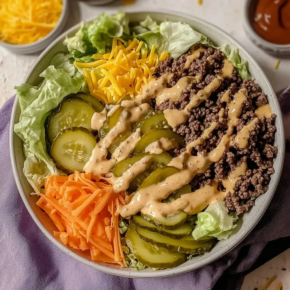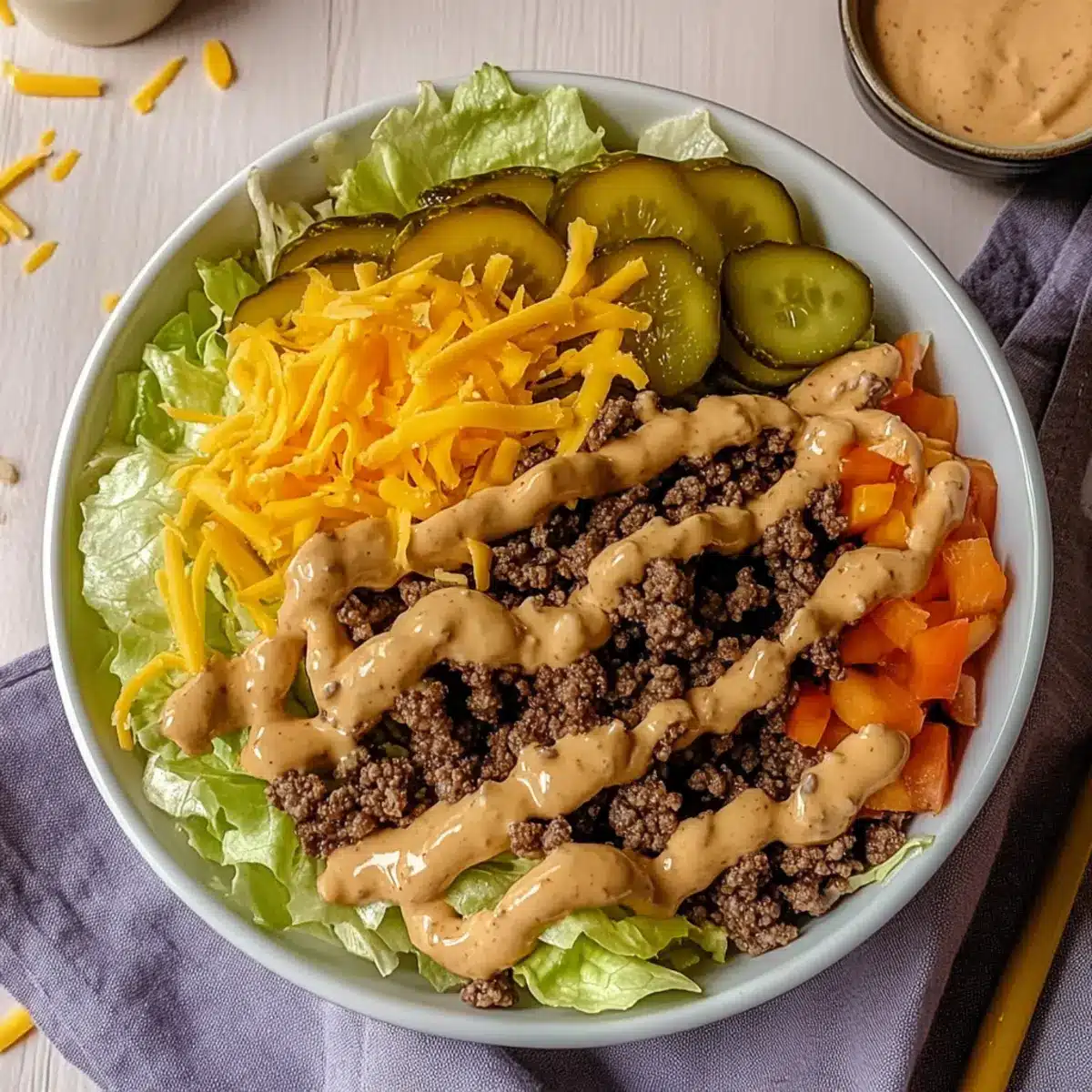 These Big Mac Salad components are perfect for busy home cooks looking to save time during the week! You can prepare the ground beef up to 3 days in advance and refrigerate it in an airtight container. Also, chop the lettuce, onions, and pickles up to 24 hours ahead, storing them separately to maintain their crunch. The special sauce can be whisked together and kept in the fridge for up to a week—just remember to let it sit for a few minutes before using to enhance the flavors. When you’re ready to serve, simply layer the prepped ingredients in a bowl and drizzle with the sauce for a delicious, fresh meal that will satisfy those Big Mac cravings without the guilt!