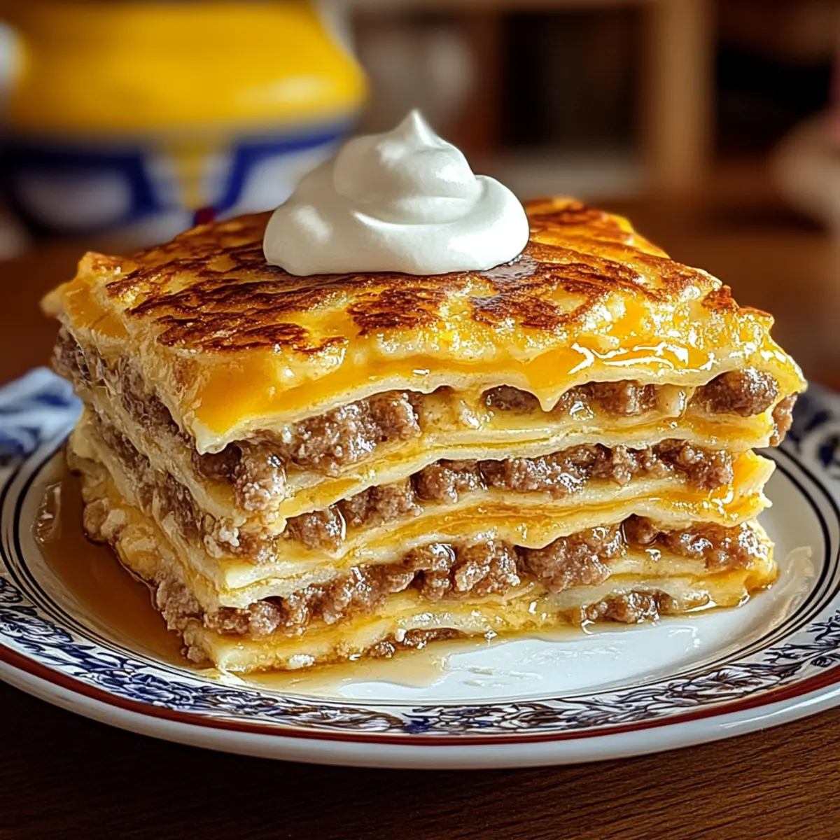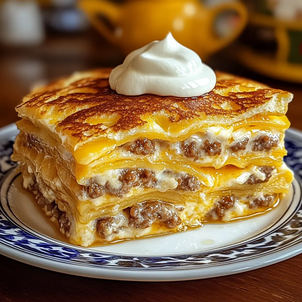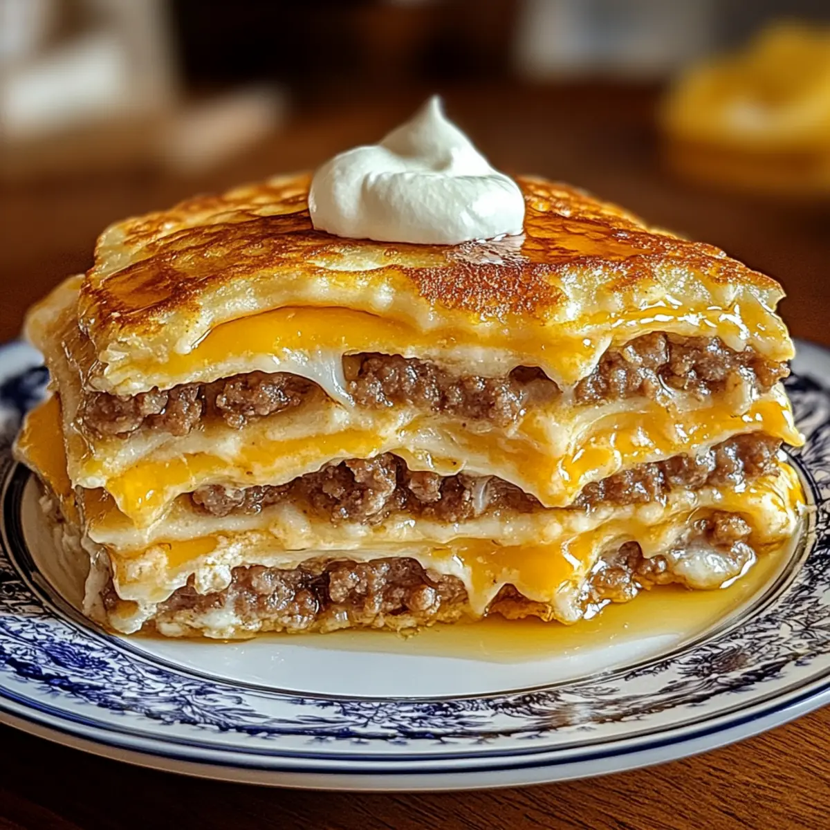 Irresistible Layers: This Breakfast Lasagna offers a delightful twist on traditional breakfast dishes, combining the fluffiness of pancakes with the savory kick of sausage.