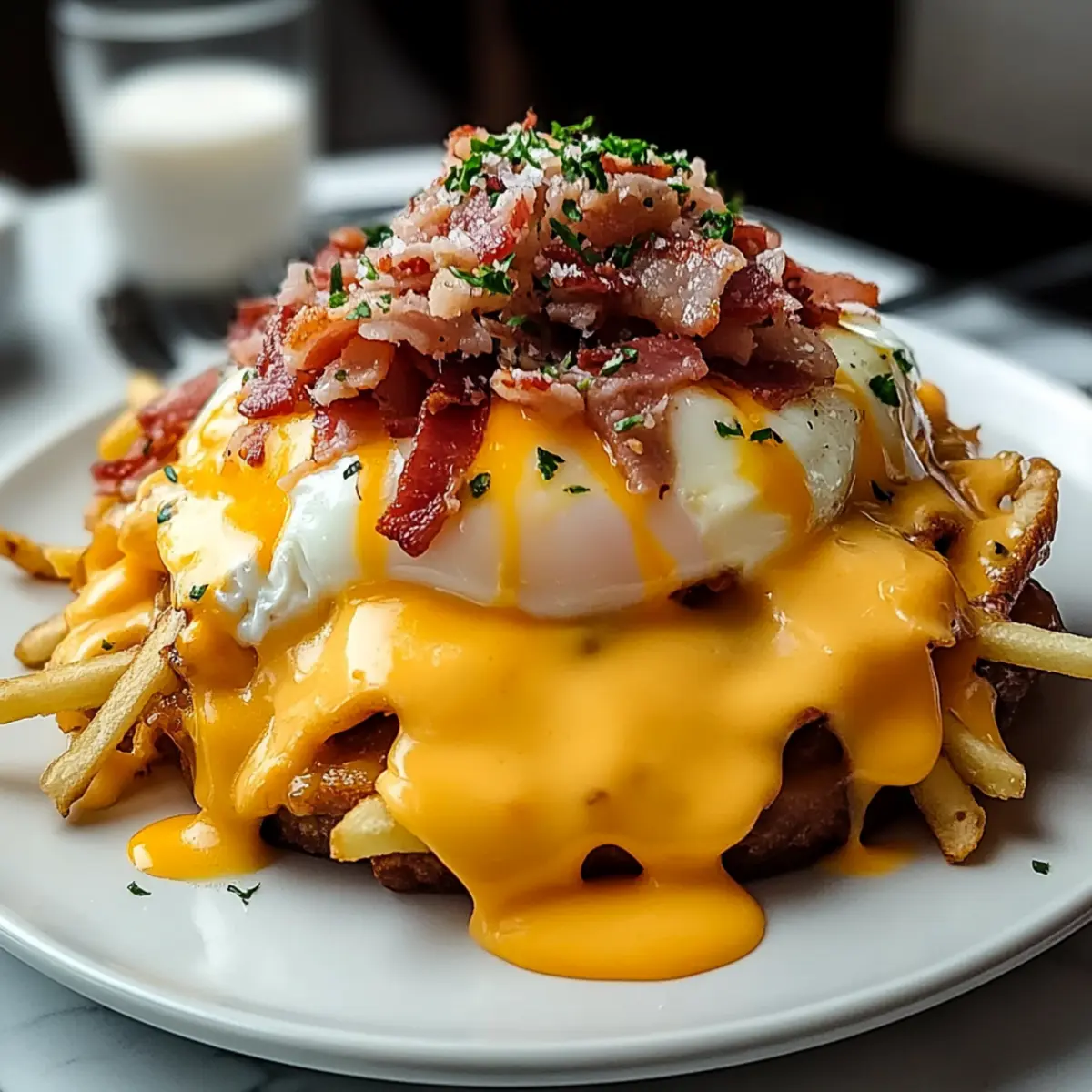 Now it’s time to put everything together! Start by placing a generous portion of crispy hash browns in each serving dish. Layer shredded cheddar and mozzarella cheese over the hash browns, then ladle on hot gravy to melt the cheese. Top this with the crumbled beef bacon and carefully place the poached eggs. Finally, drizzle the creamy hollandaise sauce generously over the top, and finish with a sprinkle of fresh chives or parsley before serving.