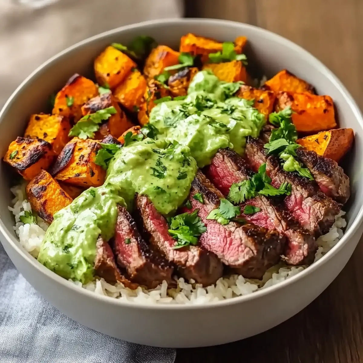 Steak and Sweet Potato Bowls with Avocado-Cilantro Drizzle Delight