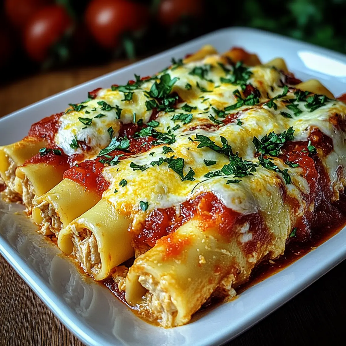 Once baked, remove the Cheesy Chicken Manicotti from the oven and let it rest for about 5-10 minutes. This resting time allows the dish to settle, making it easier to serve. Garnish with freshly chopped parsley for a pop of color, and enjoy the comforting warmth of this delicious meal!