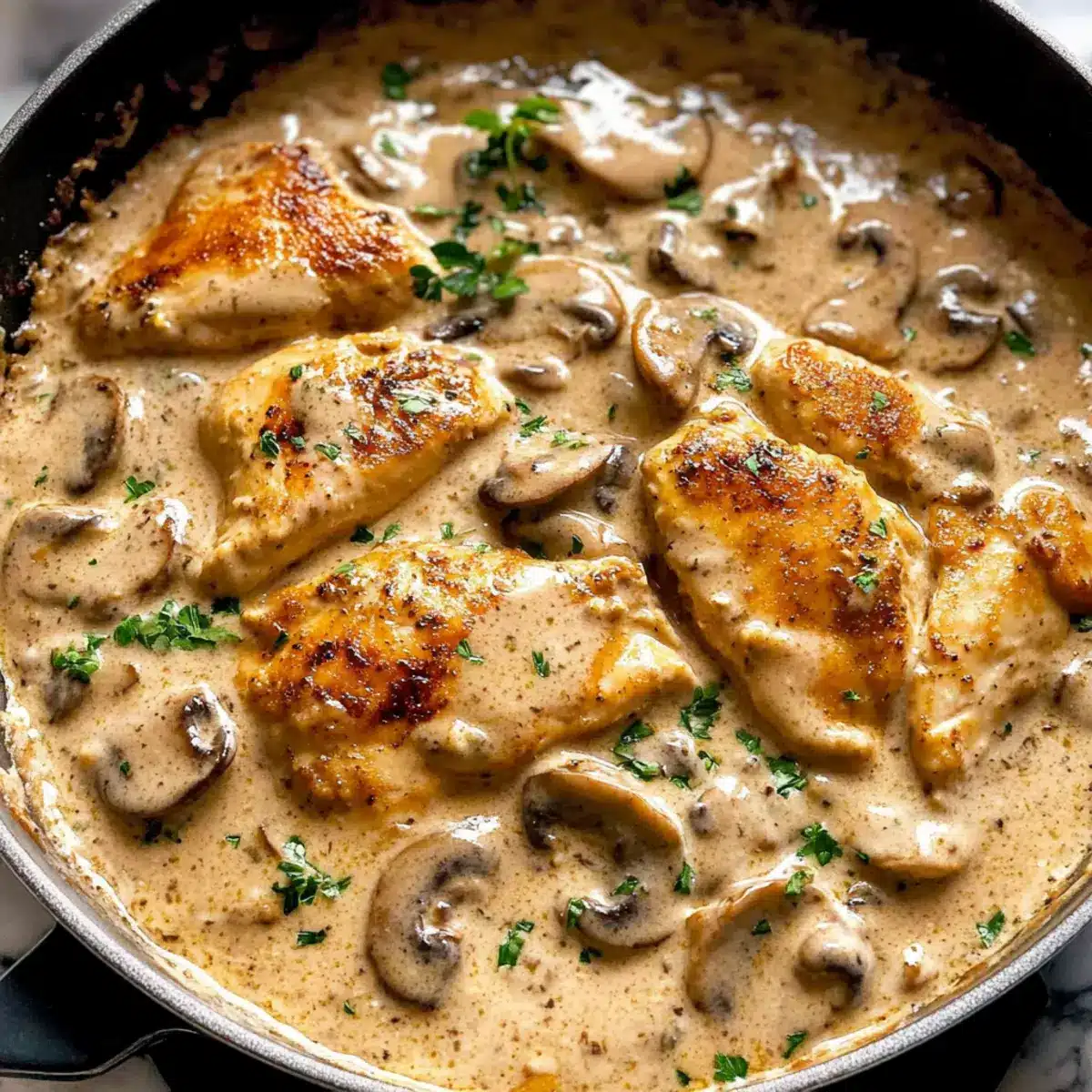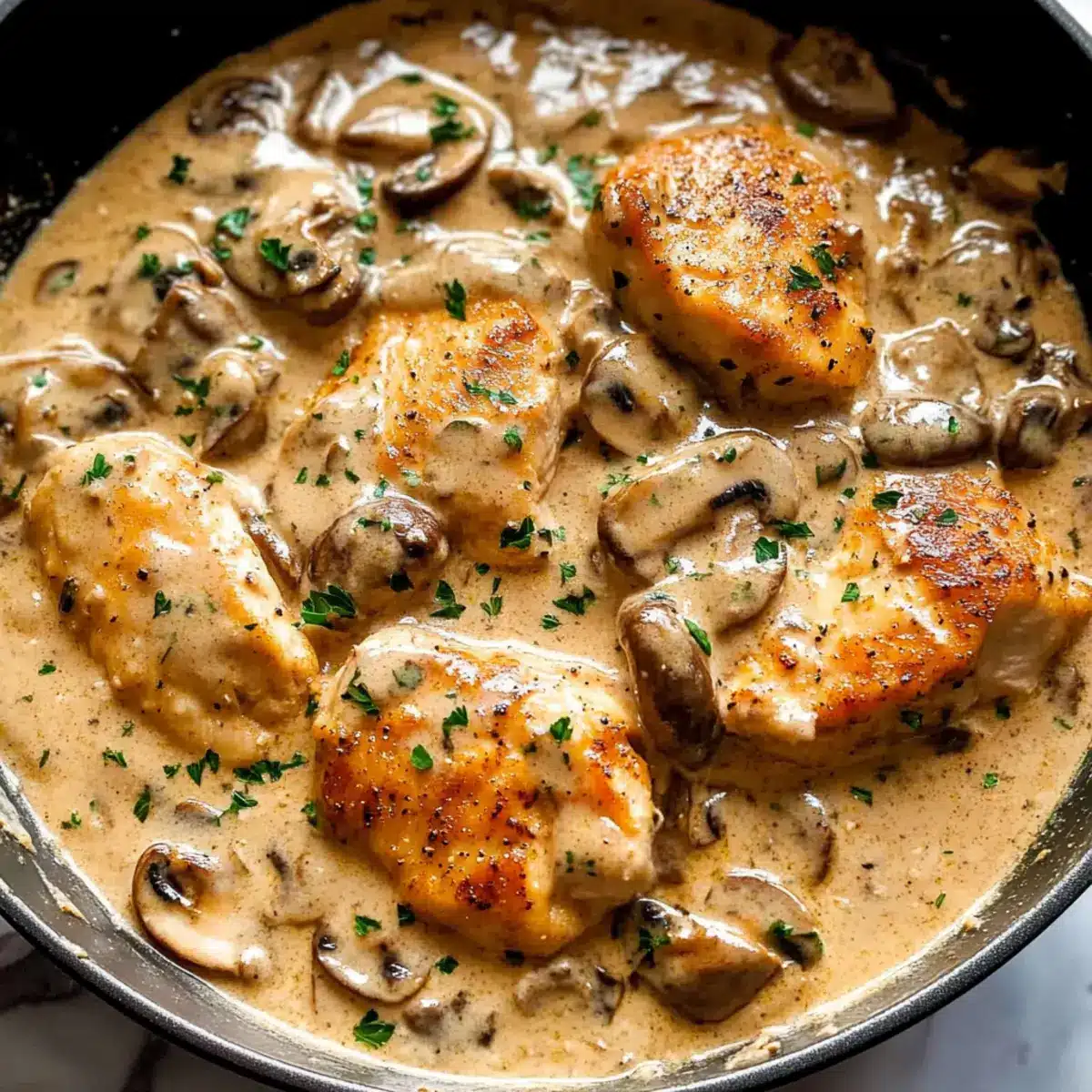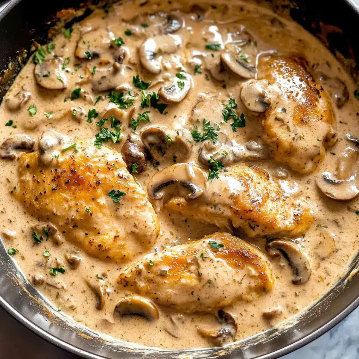 Creamy goodness: The rich, velvety sauce envelops tender chicken breasts, creating pure comfort in every bite.