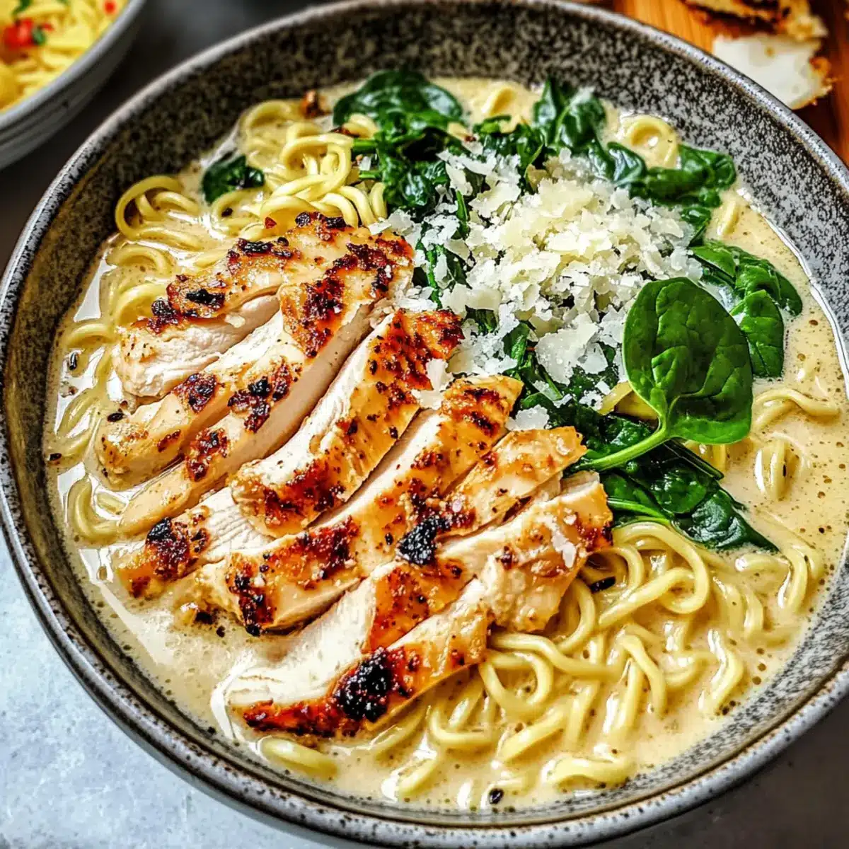 Planning ahead with this Creamy Garlic Chicken Ramen can save you precious time during the week! You can prepare the chicken and creamy sauce up to 24 hours in advance; simply cook the chicken, let it cool, and store it in an airtight container in the refrigerator. For the sauce, mix the broth, cream, and garlic, and refrigerate in a separate container. When it’s time to serve, reheat the chicken and sauce in a skillet over medium heat, adding freshly cooked or soaked ramen noodles to keep them chewy. This method ensures your dish remains just as delicious and comforting, while greatly reducing meal prep stress!