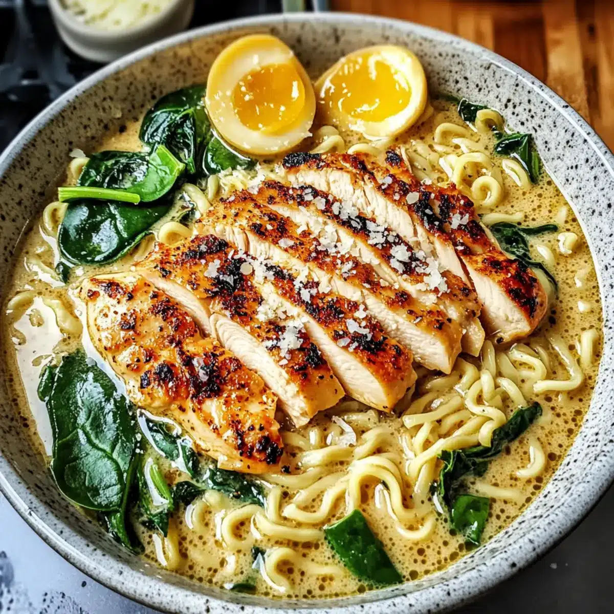 Certainly! For freezing, it’s best to freeze the creamy garlic chicken ramen without the noodles to maintain their texture. Place the cooled broth with chicken and spinach in an airtight container, and it will keep well for up to 3 months. When ready to enjoy, thaw in the fridge overnight and cook the fresh noodles just before serving.