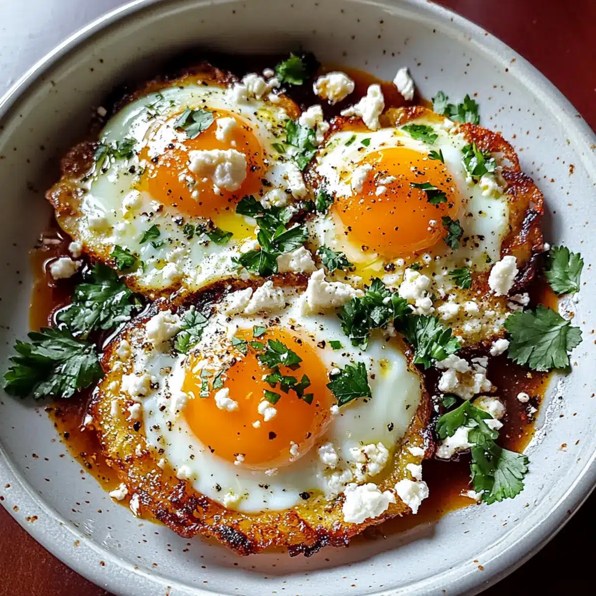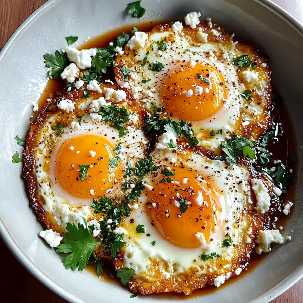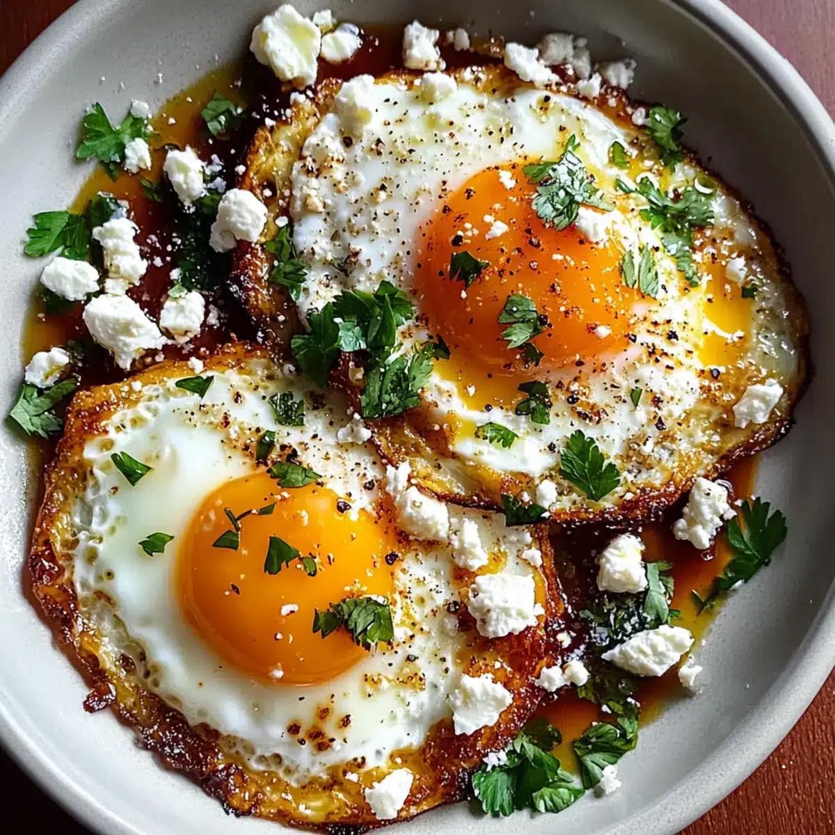 When the eggs are cooked to your liking, remove the skillet from heat. Optionally, sprinkle the top with fresh parsley and a pinch of red pepper flakes for an added kick. Gently slide the Crispy Feta Fried Eggs onto a plate, taking care to include that deliciously golden feta, and serve immediately for the best flavor and texture.