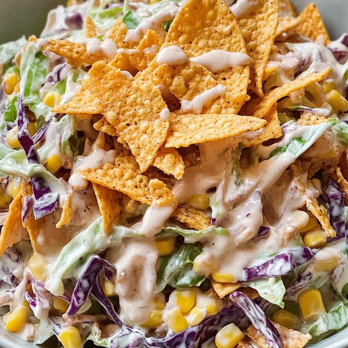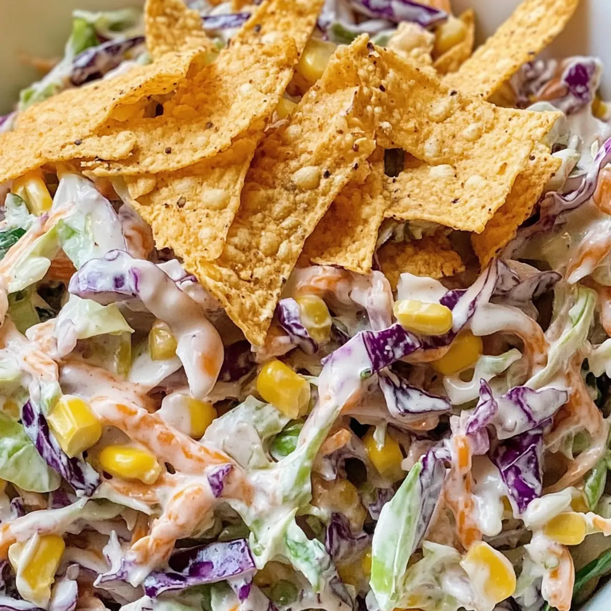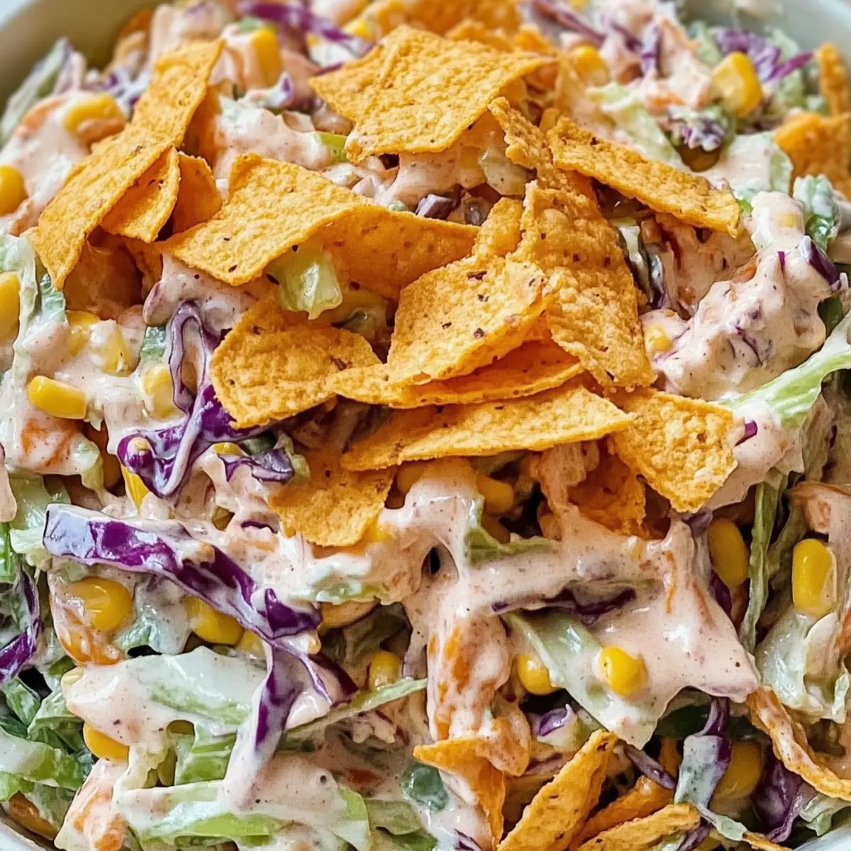 - Transfer the slaw to a serving dish or large bowl, topping it with the reserved Fritos for extra crunch and flair. Serve immediately.