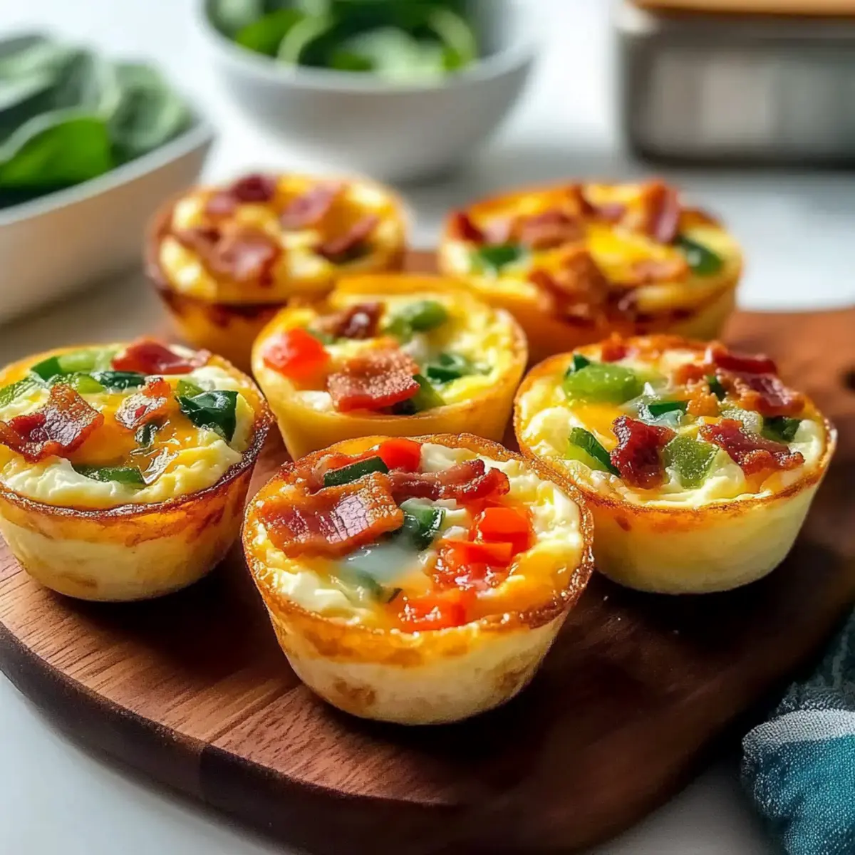 Gently fold in the diced bell peppers, fresh spinach, cooked bacon or sausage, and shredded cheddar cheese into the egg mixture. Stir just until everything is evenly distributed; be careful not to overmix, as this can affect the texture of your Customizable Egg Cups Breakfast. The colorful ingredients will create a delightful visual appeal!