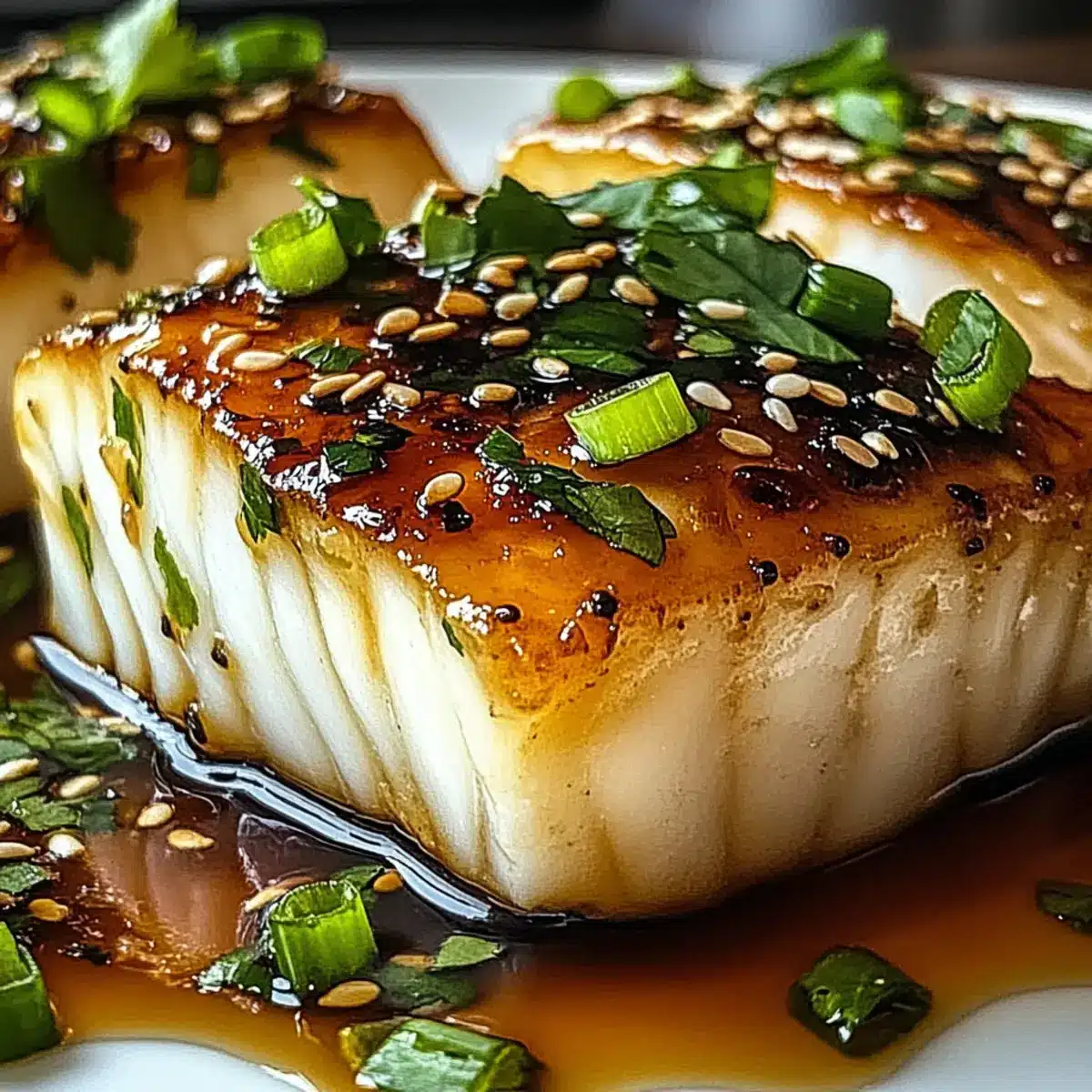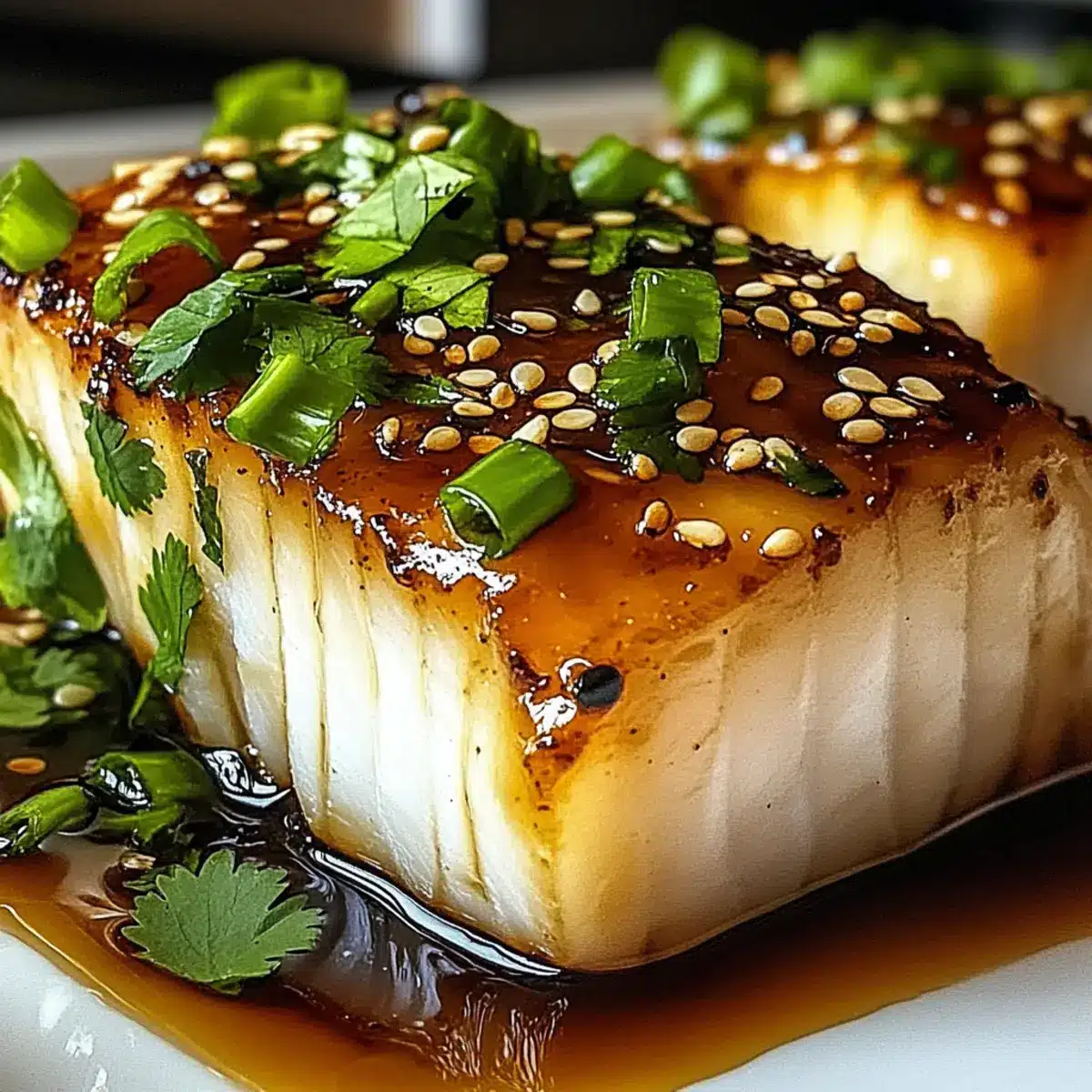 Once baked, carefully remove the cod from the oven and let it rest for a minute. Use a spatula to transfer the fillets to serving plates. Garnish with freshly sliced green onions, a sprinkle of sesame seeds, and a hint of chopped cilantro to enhance the dish’s presentation and flavor.