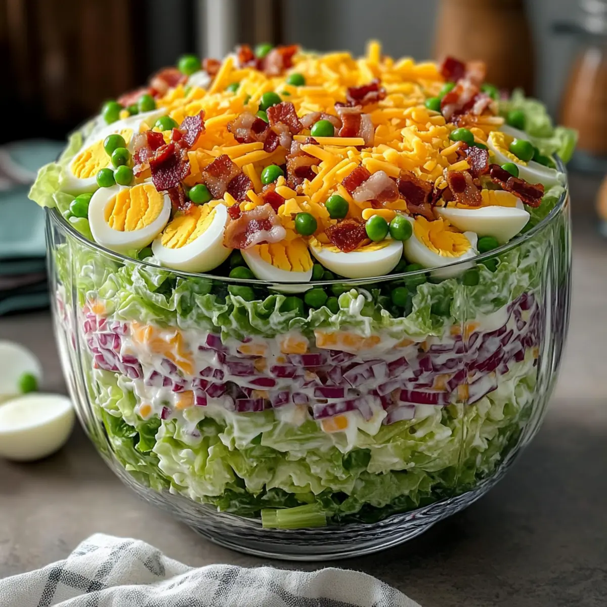 - Layer the chopped lettuce as the bottom layer in a clear glass bowl, followed by diced celery, red onion slices, and thawed peas. Add chopped hard-boiled eggs on top.