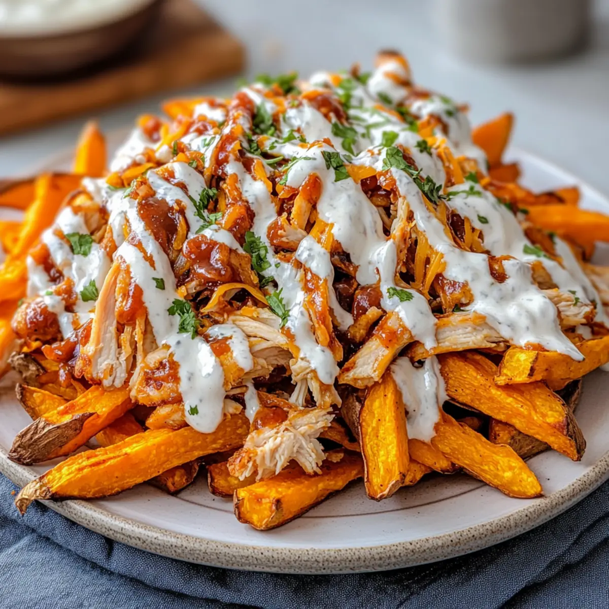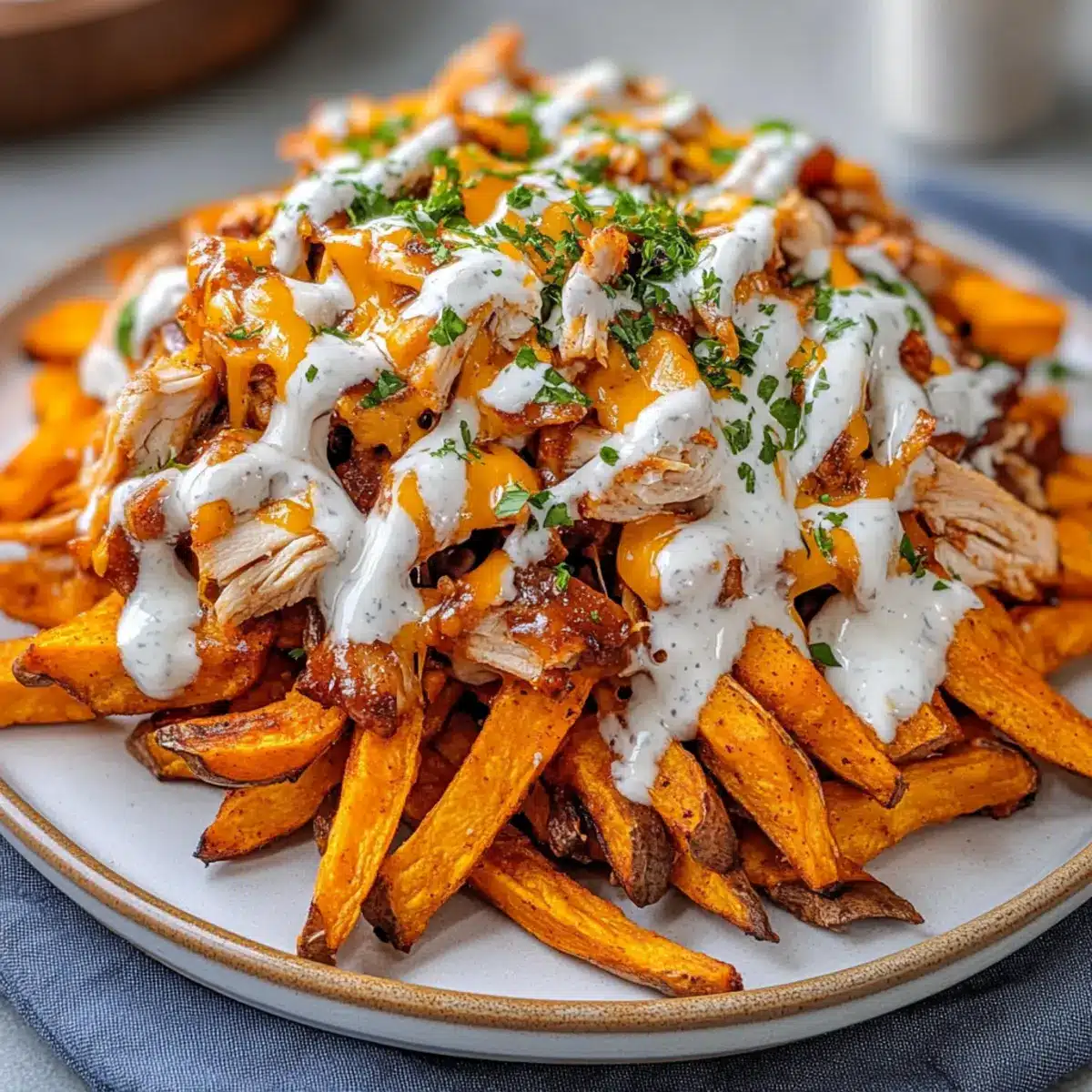 - Drizzle the ranch mixture generously over the assembled Loaded BBQ Chicken Sweet Potato Fries. Garnish with chopped green onions or parsley.
