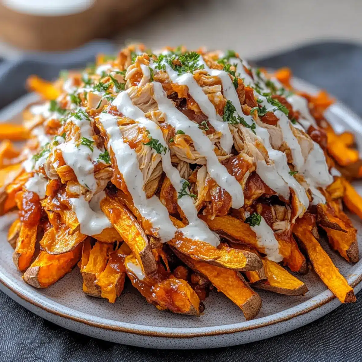 Drizzle the ranch mixture generously over the assembled Loaded BBQ Chicken Sweet Potato Fries. For a pop of color and freshness, sprinkle chopped green onions or parsley on top. Serve immediately while everything is warm and inviting, offering a delightful experience that showcases the perfect combination of flavors and textures.