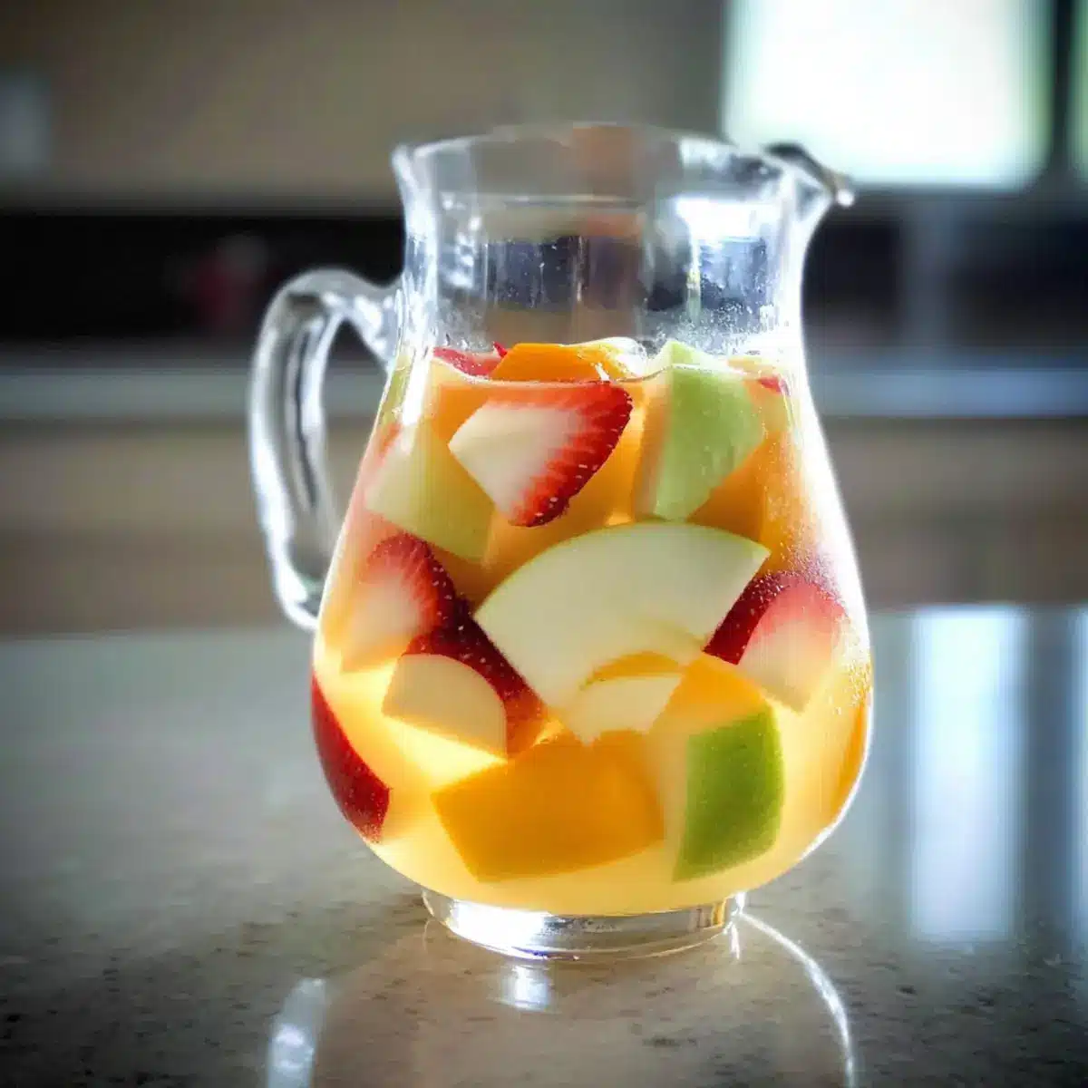- Fold in sliced strawberries, oranges, and diced green apple chunks gently, and add ice for a refreshing experience.