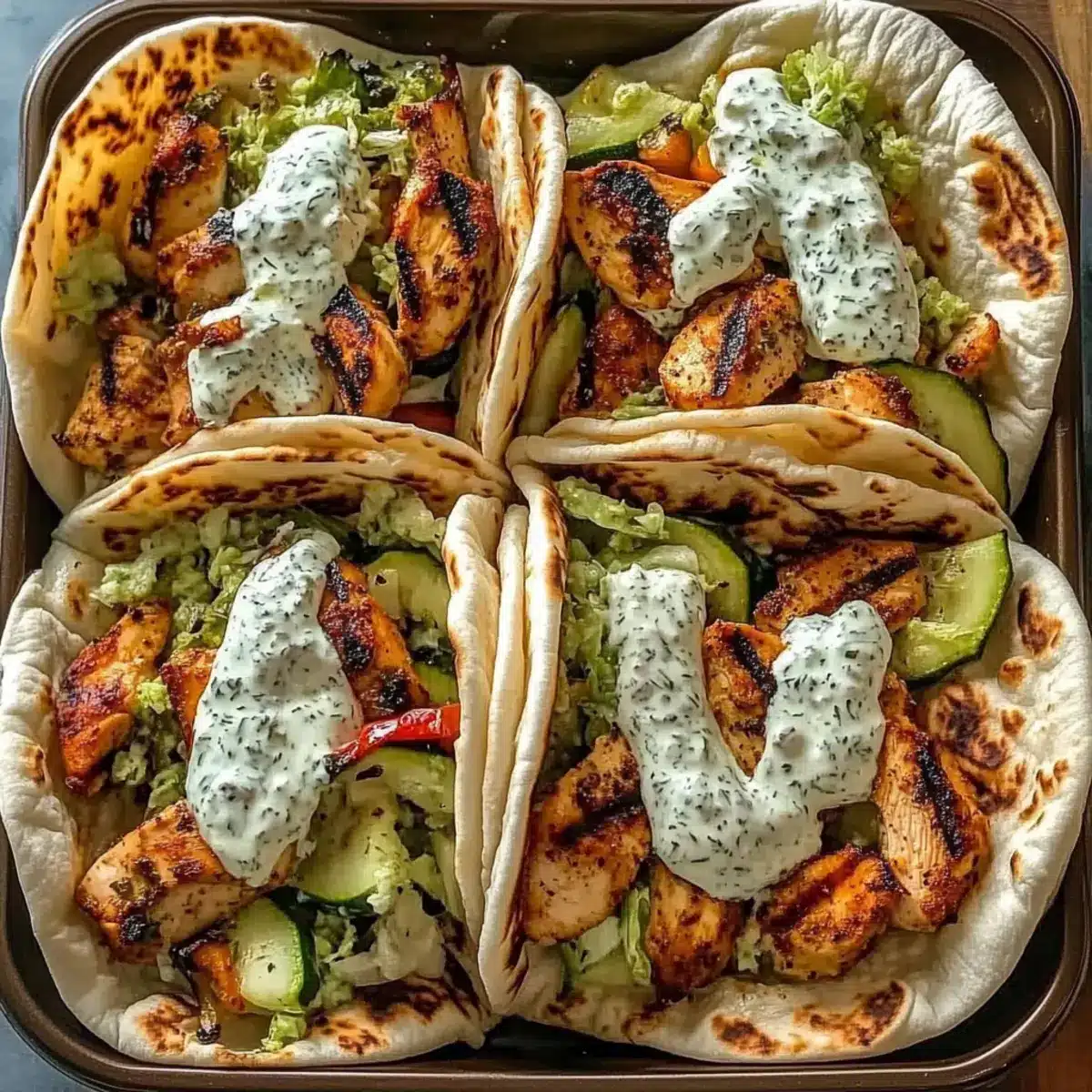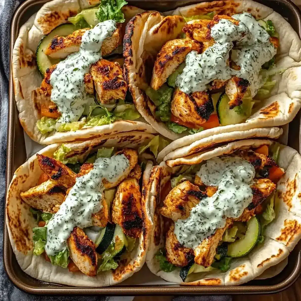 You can store any leftover chicken, vegetables, and herby ranch dressing in airtight containers in the refrigerator for up to 3 days. Keep the pitas separate to maintain their texture. When ready to enjoy again, simply reheat the chicken and veggies in the oven at 350°F (175°C) for about 10 minutes until warmed through.