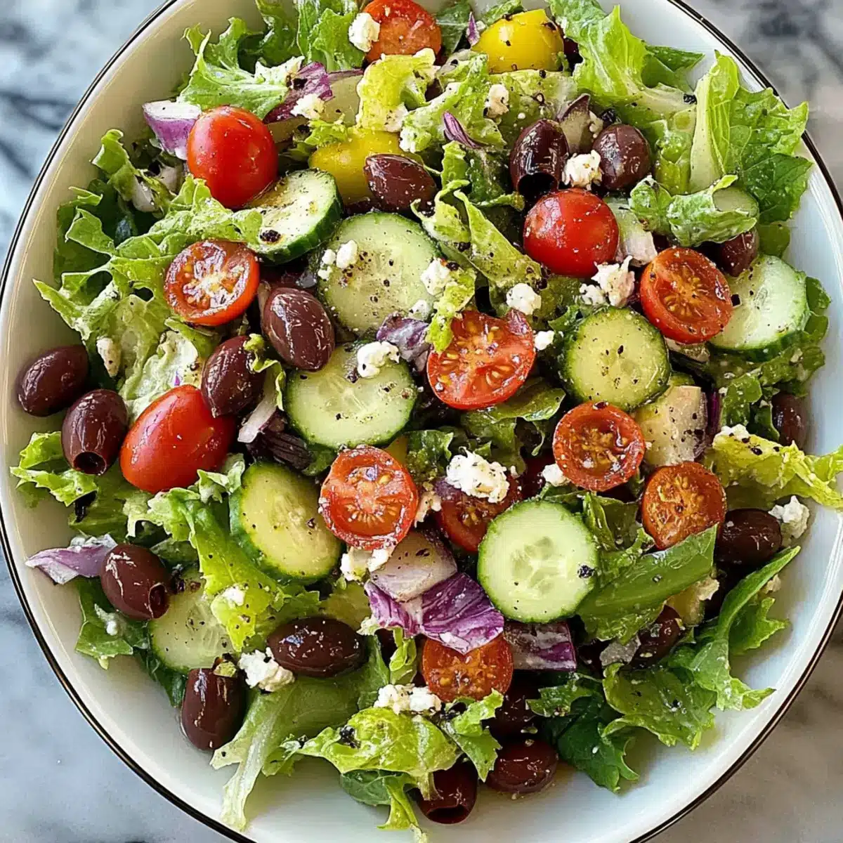 - In a large salad bowl, combine chopped romaine, cucumber, cherry tomatoes, red onion, olives, and feta cheese.