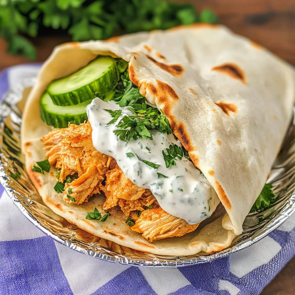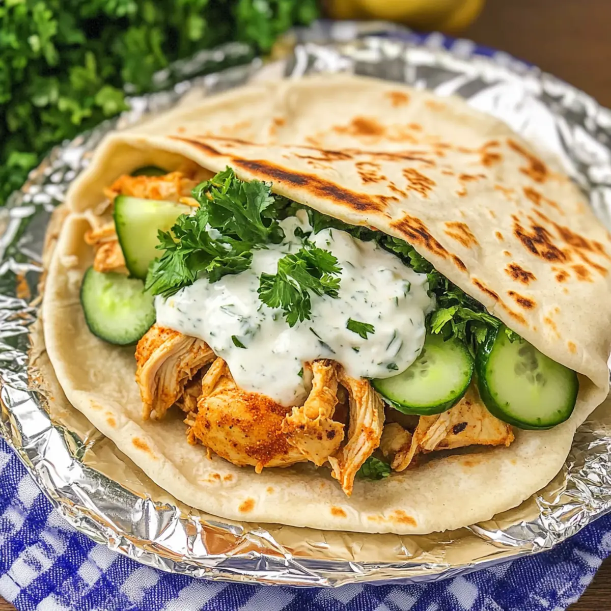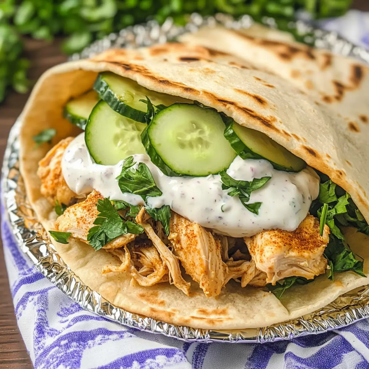 - Warm pitas and fill with shredded chicken, topped with yogurt sauce and any desired toppings.