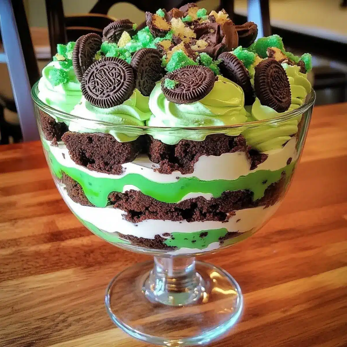 - Layer brownie squares in a trifle bowl, followed by a layer of green vanilla pudding, a layer of Cool Whip, and a layer of crushed Oreos. Repeat until all ingredients are used, ending with Cool Whip and Oreos.