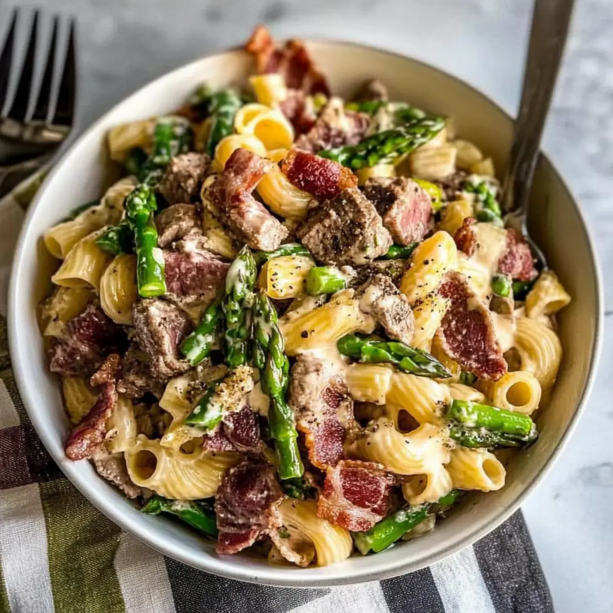 - Combine the Salad: In a large mixing bowl, toss the cooled pasta with the dressing. Add the well-seasoned steak cut into pieces, steamed asparagus, cooked bacon, and Parmigiano Reggiano.