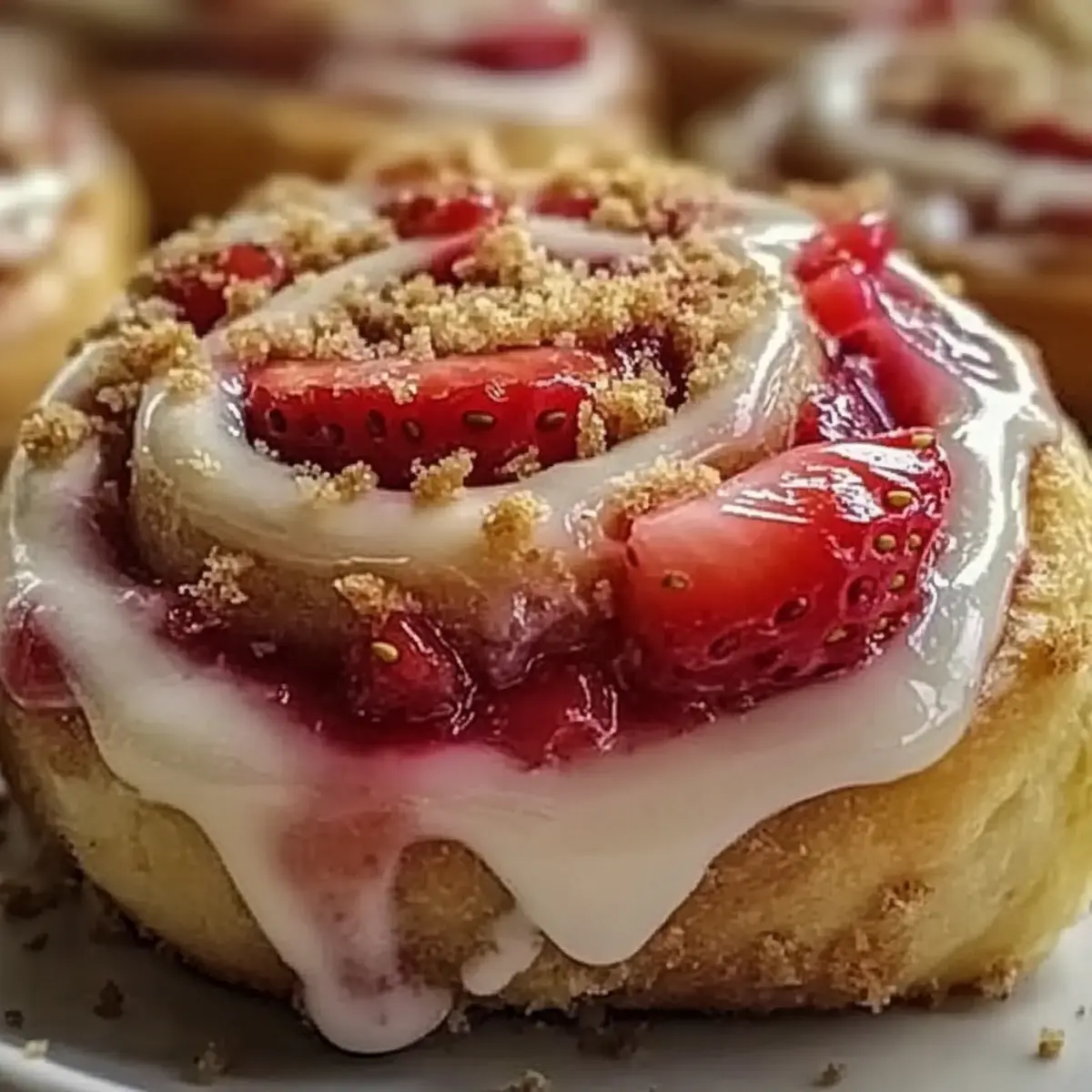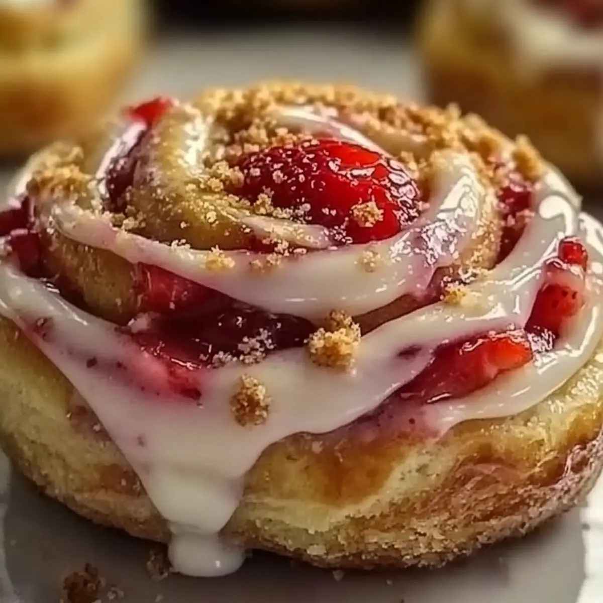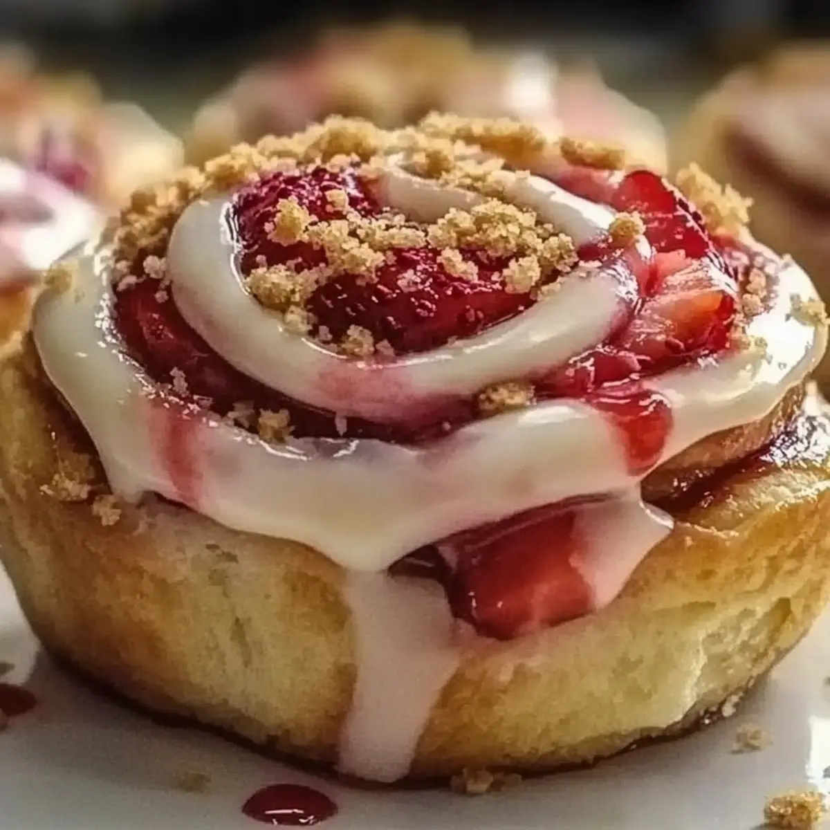 Once out of the oven, let the rolls cool for a few minutes before generously spreading the cream cheese frosting over the warm rolls. Finally, top with graham cracker crumbs and a few fresh strawberry slices for a delightful finish. The Strawberry Cheesecake Cinnabon Rolls are now ready to share and enjoy!